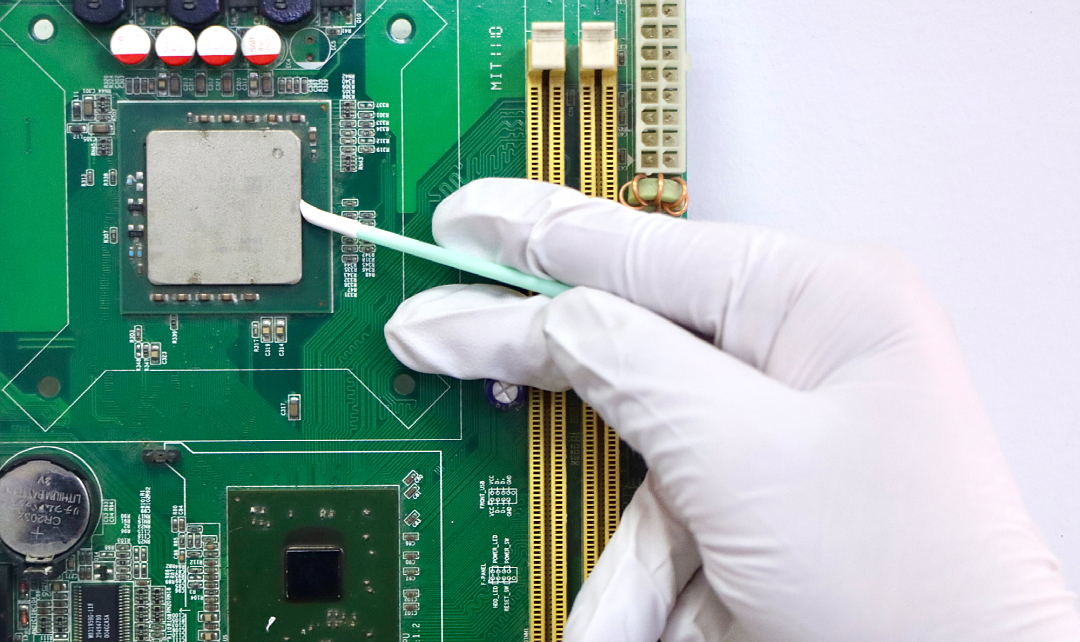 半导集成电路是一种微型电子器件或部件,采用一定的工艺,把一个电路中所需的晶体管、电阻、电容和电感等元件及布线互连一起。由于集成电路的模块多,组装模块区间高低错落,普通棉签无法贴合清洁,另外在自动化精细线中零件部位普通棉签无法触及。